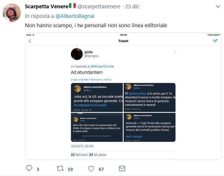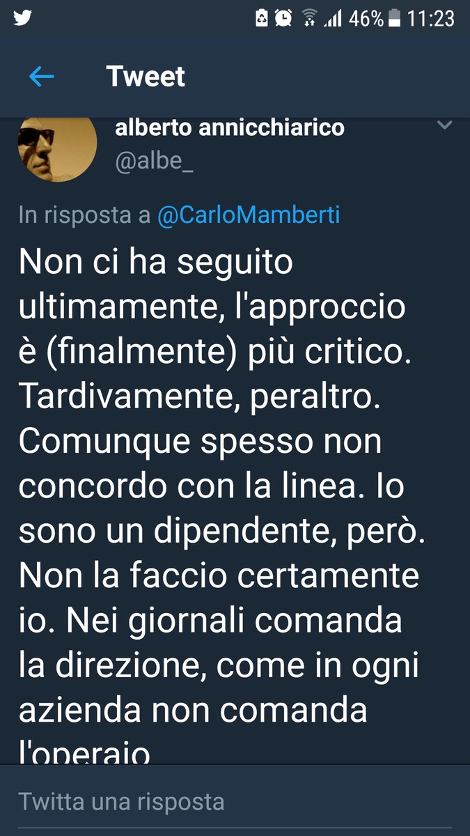 Non è esattissimamente vero che i giornalisti debbano essere completamente proni ai voleri degli editori. Diciamo che esiste un sospetto fondato di vis grata puellae. La risposta del nostro nuovo amico Frignolo Annichiarico, poi, è sinceramente imbarazzante, anche perché la linea editoriale non c’entra nulla! Come hanno attestato negli anni e continuano ad attestare i suoi tweet, lui in quella linea crede fermamente. Lo testimonia Scarpetta di Venere: