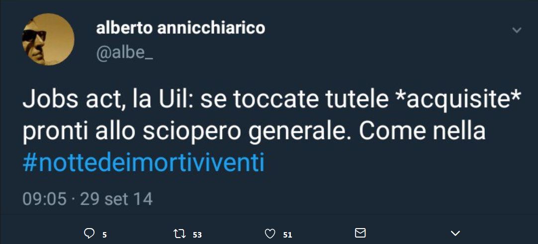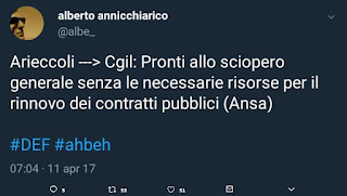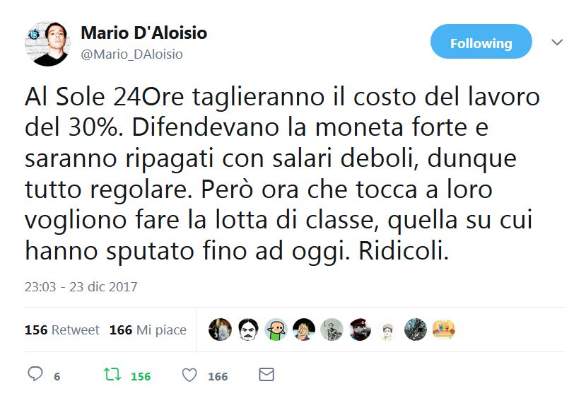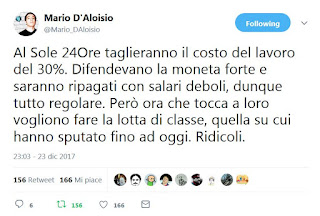Il buon Annichiarico, quello che l’Electrolux doveva tagliare gli stipendi perché #avevastatolaCina e loro invece sono in crisi perché #sesòmagnatitutto, continua imperterrito a difendere le politiche di tagli dei redditi, senza proprio che gli passi per la testa che in un paese il cui Pil è tornato indietro di 20 anni l’euretto per il giornale dei padroni (che tanto oggi ti canta la stessa canzoncina del giornale dei lavoratori) non potrà spenderlo chi non ce l’ha, e non ce l’avranno soprattutto quelli ai quali le politiche che Annichiarico esalta lo avranno tolto. E gnente! Tanto sprezzo per i diritti degli altri lavoratori (quelli a monte della catena), tanta iattanza:
