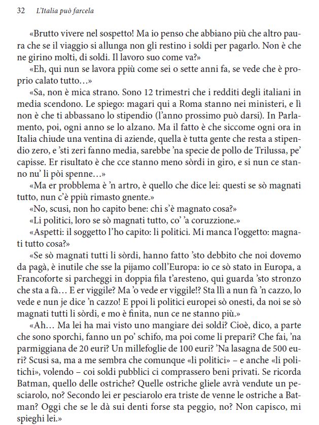 Ecco, vedete: Flaiano definì l’Italia un paese dove la realtà supera la fantasia. Questo non succede sempre: qualche volta la fantasia prende il vantaggio. In questo caso è successo, e, se permettete, ne vado fiero!