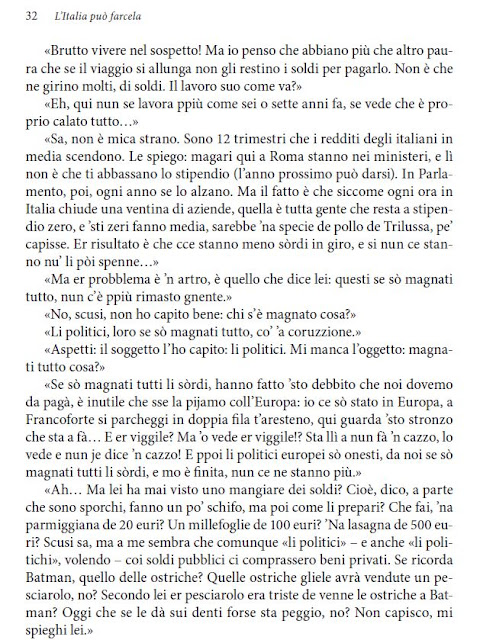A testimonianza del fatto che l’involontaria citazione del mio tassista da parte di Annichiarico non è antifrastica, cioè che lui è ben convinto di quanto dice, e non ha assolutamente capito in quale meccanismo è preso, quale sia l’ingranaggio che lo schiaccia (nel meritato dileggio generale), vale questa osservazione di Silvia di Livorno: